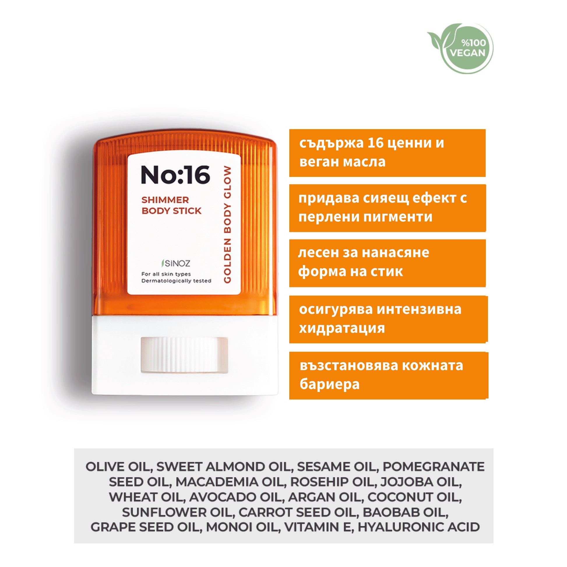SINOZ No:16 Shimmer Body Stick – добавете златист щрих към вашата кожа и се насладете на сияние, мекота и дълбока хидратация – навсякъде и по всяко време!